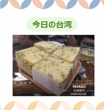 日本語:ガーリックトースト 中国語:香蒜吐司 ピンイン:xiāng suàn tǔ sī 注音: ㄒㄧㄤ ㄙㄨㄢˋ ㄊㄨˇ ㄙ